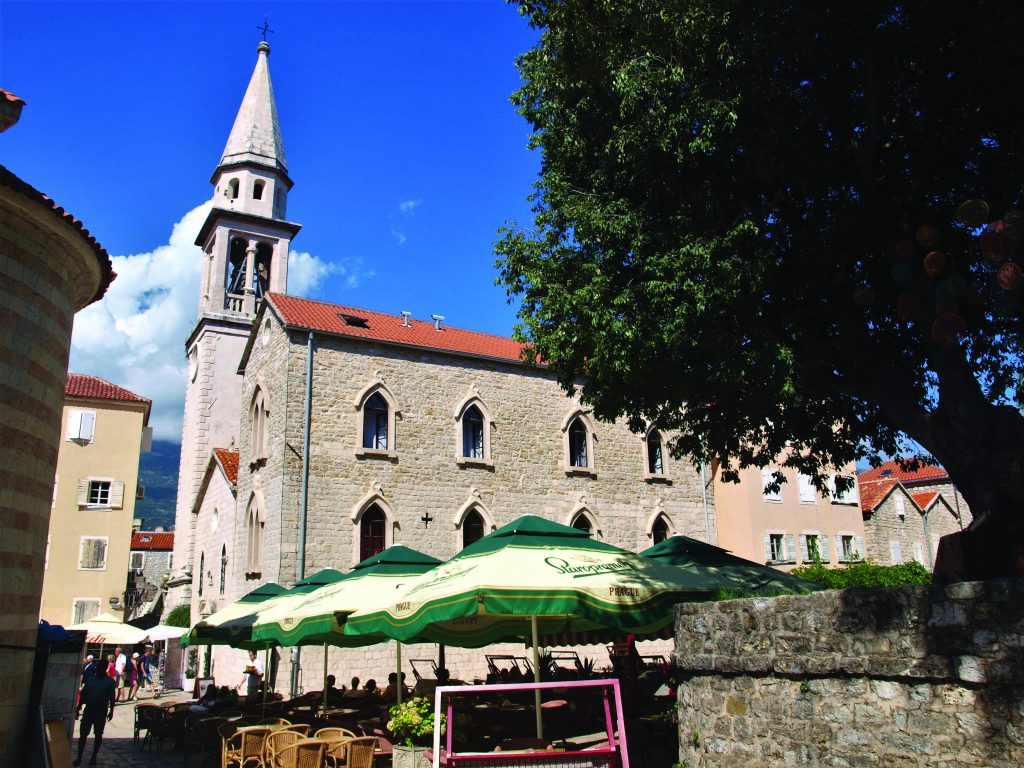 Crkva sv. Ivana Krstitelja na velikom trgu, posvećena je zaštitniku Budve. Jedna je od najstarijih crkava na jadranskoj obali iz oko 1200. god., višekratno rekonstruirana, i po otomanskom rušenju 1571., i po potresu 1667. Jednobrodna bazilika s bočnim oltarnim kapelama, sakristijom i korom. Oltarni je prostor izdvojen, odvojen balustradom i uži, markiran gotičkim neožbukanim lukom, na koji se nastavlja svod istoga profila. 1970-ih je uklonjen drveni oltar. Akad. slikar Ivo Dulčić izradi i smjesti mozaik s likom svetoga Ivana Krstitelja, s 24 kvadrata, iz muranskog stakla. Crkva je intimne dimenzije, s finim osvjetljenjem i korom za vjernike. Dvokatni biskupski dvor nadvisuje južni brod s kapelama. Neobično je ovakvo usporedno slaganje. Biskupski dvor zasjenjuje visinom samu crkvu, i doniminira uspravnošću višeg pročelja. Vanjština je kamena, s gotičkim biforama pročelja biskupskoga dvora, i rozetama na vrhu oba zabata. Nad portalom stoji: NON SVRREXIT, MAIOR-HOSPES, ADES LIMEN QV(od)EST BIPENETRALE SACERDOSHIC SEDET ANTISTES BVTVAN(VS)TVVSA. D. MDCXL“: Nije uskrsnuo veći. O stranče, na pragu si dvostrukih vrata. Ovdje stoluje budvanski tvoj biskup. Ljeta Gospodnjeg 1640.” Crkvu naizgled čuva onkraj prekrasni zvonik, h=36 metara iz 1867. godine, tirolskog arhitekta Lucchinija. Daje i naglasak silueti grada, prepoznatljivim oblikom i vitkošću. Peterodjelno je raščlanjen. Najdonji dio je statički skošenih zidova, glavni dio uglavnom ožbukan, s urom pri vrhu, pa glorieta s biforama, koja daje prozračnost, i osjećaj lakoće prema nebu, i na koncu osmerokutna perforirana prizma sa zašiljenom piramidom povrh. Južno su oltar Gospe od Zdravlja iz XVII. st., sa slikom iz Tiepolove škole i oltar Svetoga Križa sa slikom Krštenja Gospodinova slikara Antonija Florianija iz 1835. godine. Sjeverna kapela, u mramornom raskošnom oltaru, čuva dragocjenu ikonu Majke Božje, “Budvansku gospu”, jednu od najstarijih ikona u Crnoj Gori, iz XII. ili XIII. stoljeća. Dopremljena je iz drevne crkve Santa Maria u Punti, pred dolazak Napoleonske vojske 1807. Postoje legende o njenom dolasku i čudotvorstvu. Nalazimo ostatke freskoslikarstva (pictores graeci) iz prve polovine XIV. stoljeća. U katedrali čuvaše zapečaćenu škrinjicu s ulomkom križa s razapetim Isusom, pokrivenim crvenim papirom i drugom drvenom tirkiznom sa zlatnim zvijezdama. Kanonik Medin svjedočio je o slučaju misteriozne nemogućnosti isplova stranih trgovačkih brodova, unatoč povoljnim uvjetima. Nadbiskupu Zmajeviću predadoše tirkiznu drvenu škrinjicu sa zlatnim zvijezdama i moćima, s broda nekadrog isplova. U katedrali nadbiskup položi škrinjicu u sanduk, i istek lađa otplovi bez smetnji, po proljepšanom vremenu. Otad se škrinjica nosi u procesiji, o blagdanu sv. Ivana Krstitelja. U njoj bijahu k tome natpis na papiru Lignus S. Crucis, moći sv. Simforijana, sv. Felicijana, sv. Nigila, sv. Valerija i sv. Inocenta, komadić hlača sv. Filipa Nerija, dva Agnus Dei pape Aleksandra VII. te razni drugi ulomci. Škrinjica se izgubi. Kao najveća dragocjenost čuva se srebrni pozlaćeni moćnik sv. Križa, sa zlatnim križem, dio Kristova križa, pričvršćen za podnožje s glavicama krilatih anđela. Rubovi križa ukrašeni tordiranim užetima, s isijavajućim kutnim zrakama. Većina crkvenog relikvijara nesta. Osim moćnika svetoga Križa, sačuvaše: srebrnu mletačku tamjanku, kadionicu, dva srebrna kaleža, iz XVII. i XVIII. st., srebrnu pokaznicu, pladanj s gotaricama, dar cara austrijanskoga i kralja hrvatskog Franje JosIpa iz 1875. Srebrni moćnik sv. Ivana Krstitelja iz 1886. Na postolju latinski: Commvnitas catholicorum bydvensis / divo svo patrono, i hrvatski: Katoličko pučanstvo Budve / Nebeskomu svojemu pokrovitelju. Pohranjene su i relikvije sv. Petra apostola, sv. Pavla apostola, sv. Nikole biskupa, sv. Roka, sv. Josipa i groba BDM. 16 srebrnih svijećnjaka, dar naraštaja plemičke obitelji Antonioli, srebrni: pokaznica s medaljonima, reljef sv. Ivana Krstitelja, procesijsko raspelo iz XIX. st., vratnice za Božji grob Srebrni Ciborij, djelo mletačkih radionica prve polovice XVIII. stoljeća. Srebrno procesijsko raspelo rad dubrovačkog zlatara Nikole Gjivovića. Crkva je na najvećem trgu u budvanskom Starom gradu, s crkvama: Santa Maria in Punta, Sveti Sava Osvećeni, Sveta Trojica, ostatci ranokršćanske bazilike i crkve Svete Marije u Citadeli. Na trgu među crkvama ljeti je bogati kulturni program i predstave budvanskog Grad teatra. Jednog lijepog sunčanog ljetnog dana opušteno sjedoh u krasni zelenokameni ambient, uza zvuke milozvučne glazbe. Nije mi se žurilo, ali u praznom sam lokalu čekao konobara dvadesetak minuta. Umjesto napetosti neizvjesnog čekanja, osjećah ispunjenost i užitak u prekrasnom trenutku i mjestu.